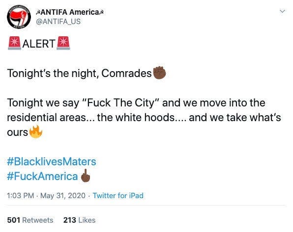 A few days ago, there was a tweet going around from an account called “Antifa_US”, calling for the looting of white suburbs. The post read: “Tonight… we move into the residential areas… the white hoods…. and we take what’s ours.”