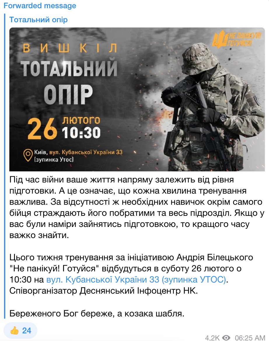 In another post, Centuria talks about the importance of training, stating, “every minute of training is important” and how “If you have been planning to prepare, it is difficult to find a better time.” It then advertises for a training session with one Andriy Biletsky: “training on the initiative of Andriy Biletsky will take place on Saturday, February 26 at 10:30 on the street.” Looking up Bilestky, I read that he is described as a white nationalist far-Right politician and the leader of the political party, National Corps. He was also the first commander of the neo-Nazi paramilitary, Azov Battalion, and a co-founder of the fascist organization, the Social-National Assembly. Founded in 2008, the Social-National Assembly was an umbrella organization for numerous ultra-nationalist and neo-Nazi groups, and its mission was “the protection of the white race by creating an anti-democratic and anti-capitalist ‘nationocracy’ system” and the eradication of “international Zionist speculative capital”. Bilestky stated in 2010 that it was Ukraine’s mission to “lead the white races of the world in a final crusade … against Semite-led Untermenschen”.