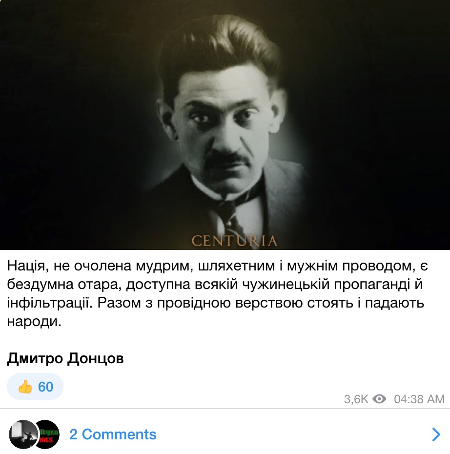 Centuria, and other paramilitaries like them, are influenced by the teachings of Dmytro Dontsov, a 20th century Ukrainian nationalist who laid the ideological foundation for OUN (the Organization of Ukrainian Nationalists) who would butcher the Poles during the Second World War. Dontsov’s influence can be seen in Centuria’s Telegram account which puts a photo of Dontsov and a quote of his: