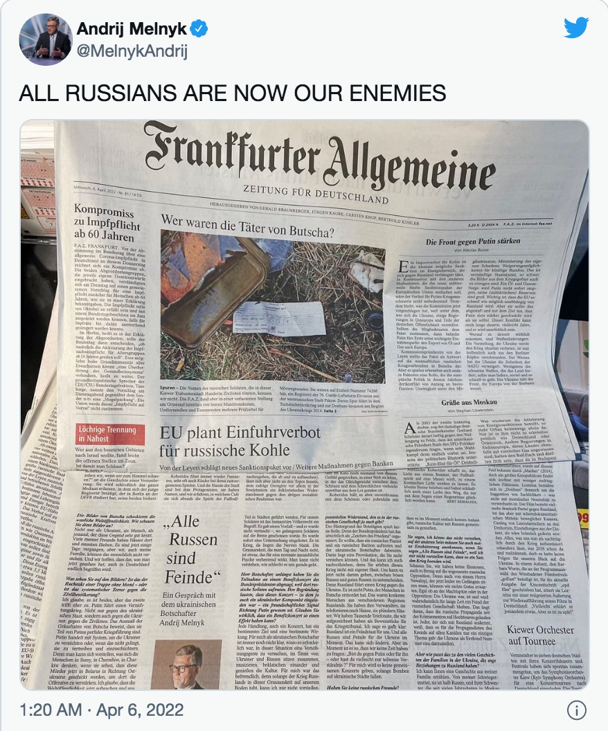 The Ukrainian ambassador to Germany, Andriy Melnyk, just declared that “All Ukrainians are our enemies,” in yet another example of prejudice towards Russians. In an interview with Faz, Melnyk said: “I will say it very clearly: Russia is an enemy state for us. And all Russians are enemies for Ukraine at the moment. That can change. But at the moment we don’t have time to ask: “Are you against Putin or for him – or maybe you only partially understand?” When asked, “Don’t you have any Russian friends?” Melnyk replied: “No, never had. For one reason: because what we are experiencing today was planned for many decades. And this war is carried out by people, by Russians – some are sent into this war, some choose to be there of their own free will. From the conviction that they want to destroy Ukraine. And that’s why it’s clear to me, probably even after the war, that Russia will remain an enemy state.”