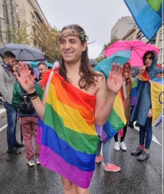 Pro-LGBT activists in Serbia want to have their pride rallies, and in the process of this a gay activist in Belgrade wrapped himself in the gay flag mocking Christ: