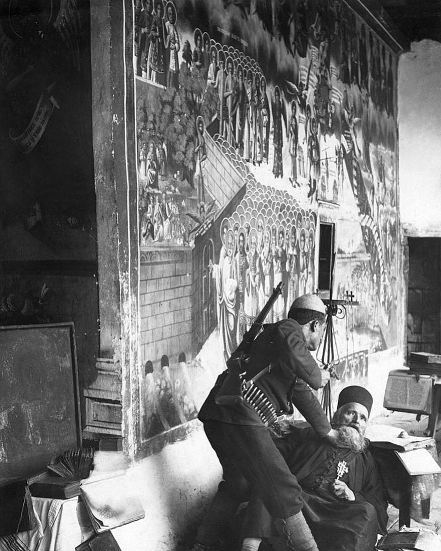 Marko Bogdanović from the village of Zrza, remembered: “On the seventh day of April, the Arnauts [Albanians] rose up in an uprising and on that occasion burned down all the settlers’ houses.” In 1941, the Albanian nationalists attacked the Deviča monastery where they murdered Damaskin Bošković and there is even a photo of the killing happening: