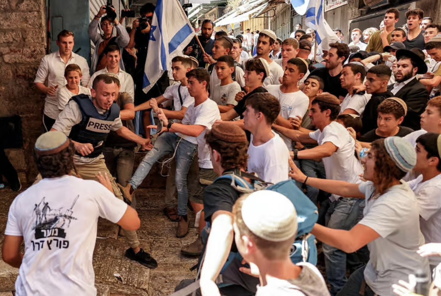 Thousands of Jewish nationalists, including far-right activists, marched through predominantly Arab neighbourhoods of the Old City, waving Israeli flags, dancing and occasionally shouting inflammatory or racist slogans.