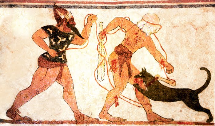 The human sacrifice of the Mediterranean peoples is not only found in ancient books, but in archeology as well. There are tomb paintings from the 6th century BC made by the Etruscans (who Tertullian tells us brought into Italy the ritual that would eventually become the gladiatorial matches). In one tomb painting there is a blindfolded man being attacked by a dog. Next to the victim is a masked figure named Phersu (whose name means “masked man”) who is armed with a whip or leash.